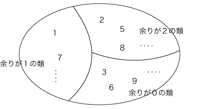 このとき,自然数の集合は,3つの類に分けられる──余りが0の類,余りが1の類,余りが2の類。