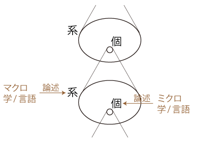 存在は,「マクロ・ミクロ」二重性である。 特に,存在の記述は,「マクロ・ミクロ」二重性になる。 このとき,マクロ記述とミクロ記述は,言語レベルの違いを立てる。 即ち,ミクロ記述は,意図的に実体論を行う。 マクロ記述は,現象論──形(かたち)論──を行う。
