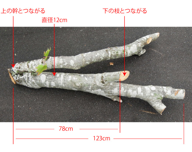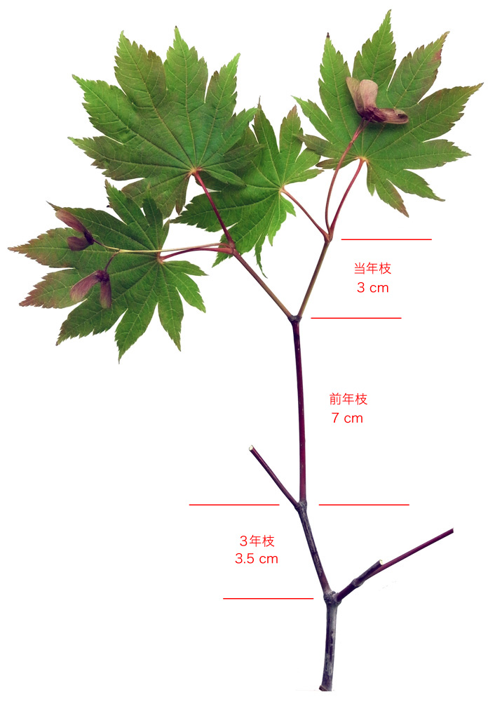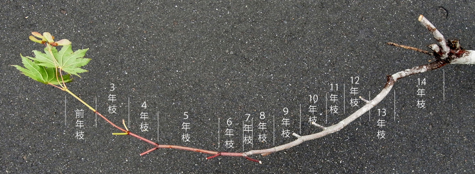 14年枝 (直径1.5cm) -(短枝)- ?年枝 (直径2.5cm)