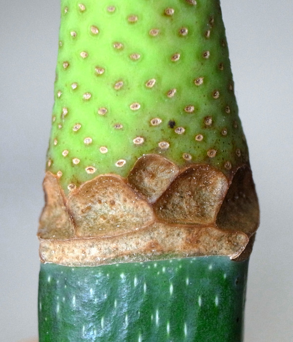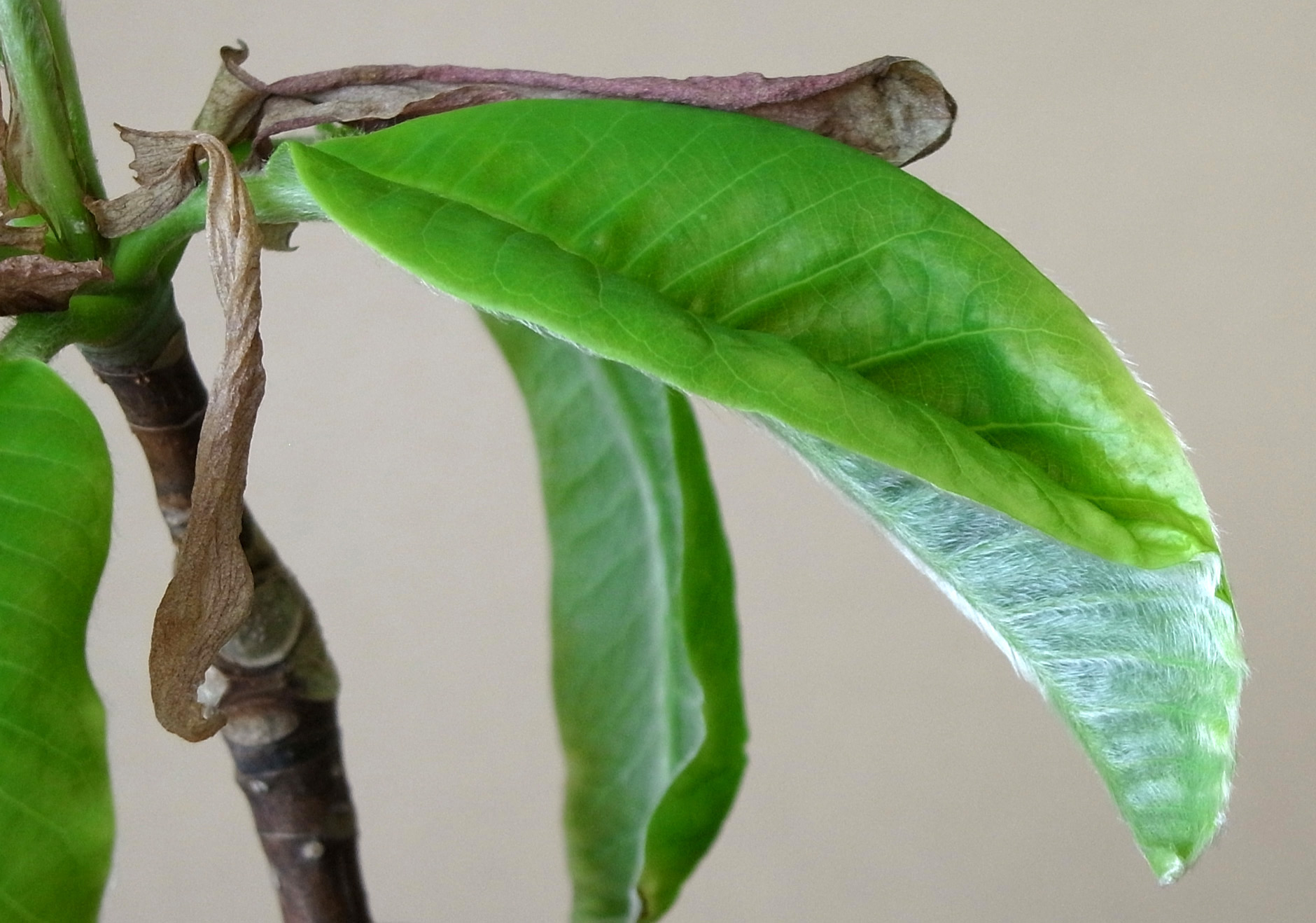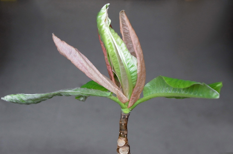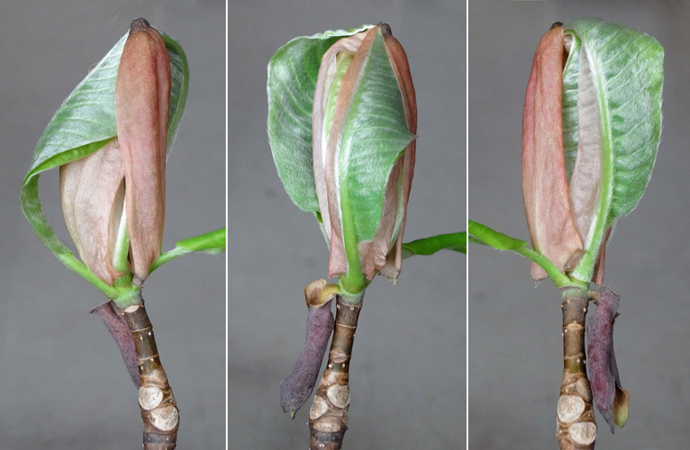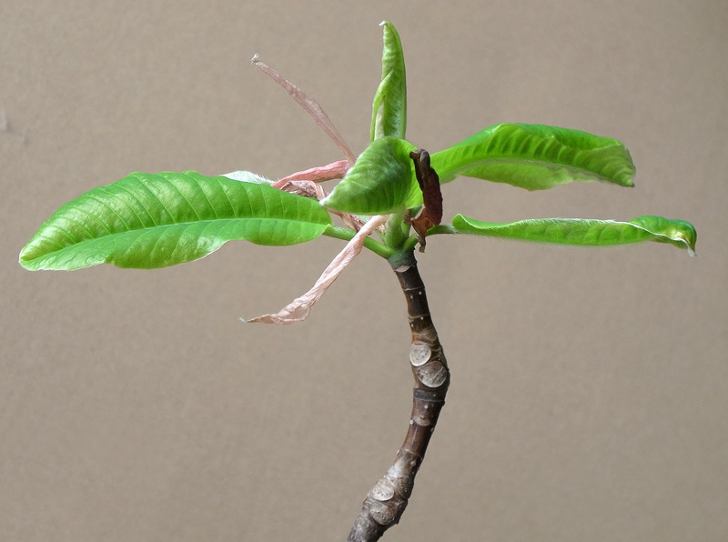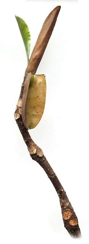冬芽の表皮が割れて茶色の袋が現れ,さらにこの袋を割って葉が出てくる
