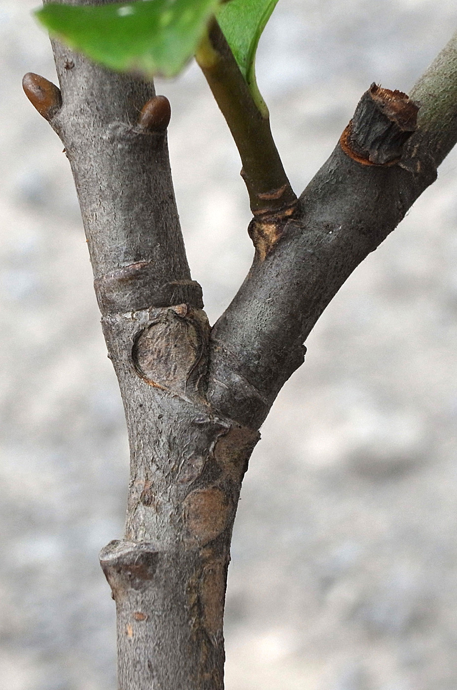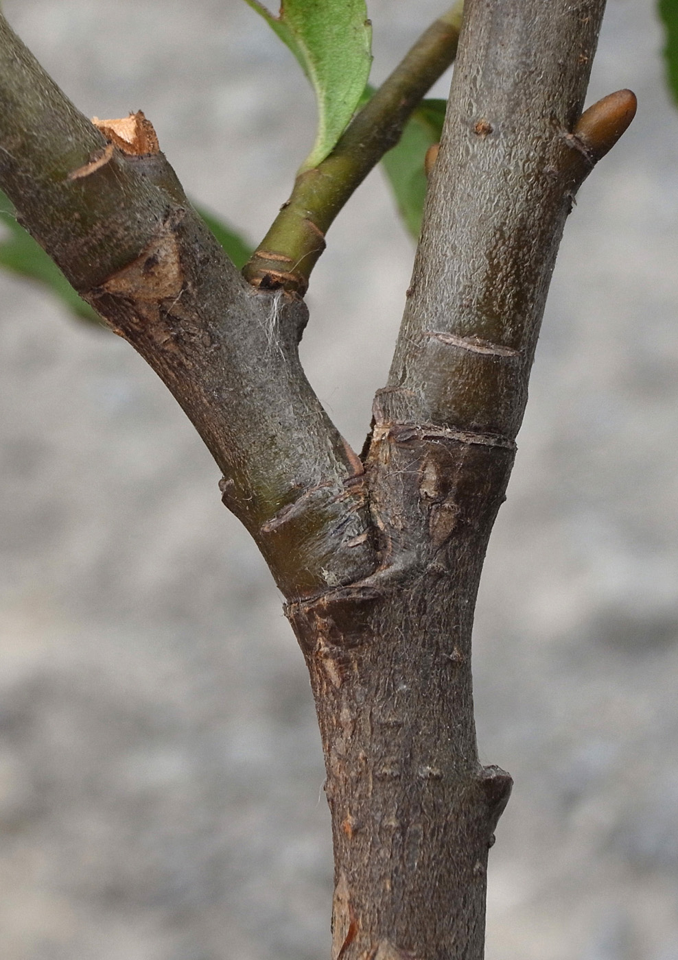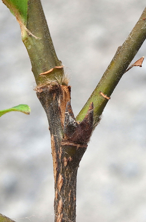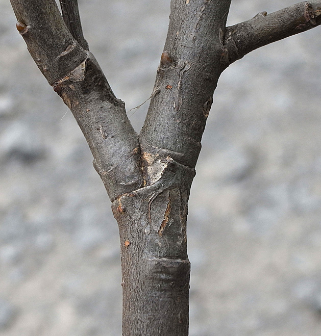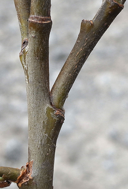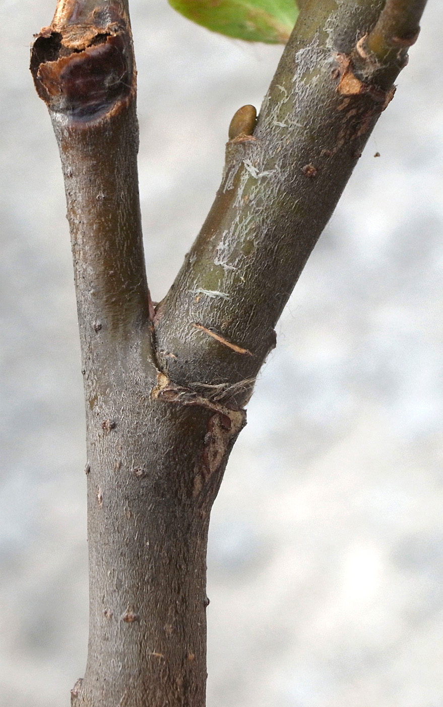 2本の当年枝がくっつき,上部で分かれる形になっている