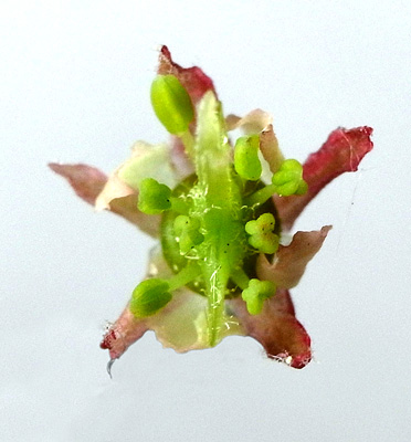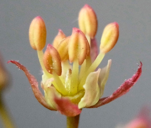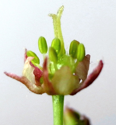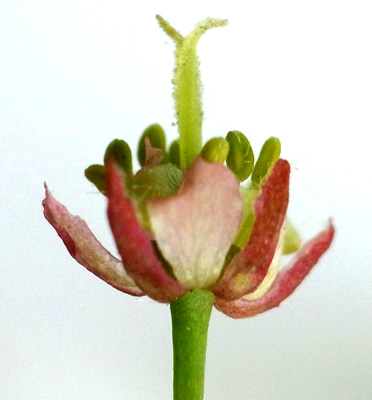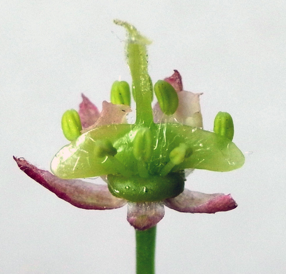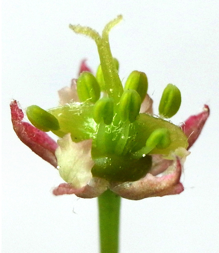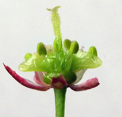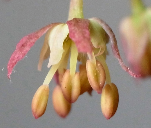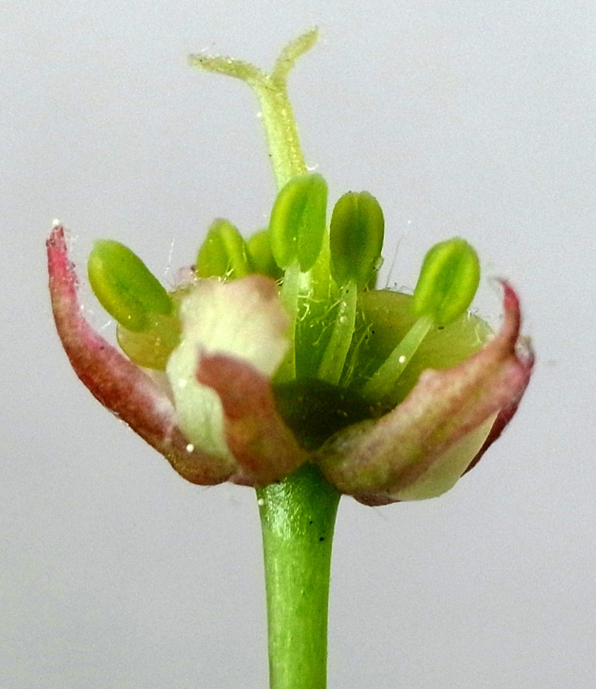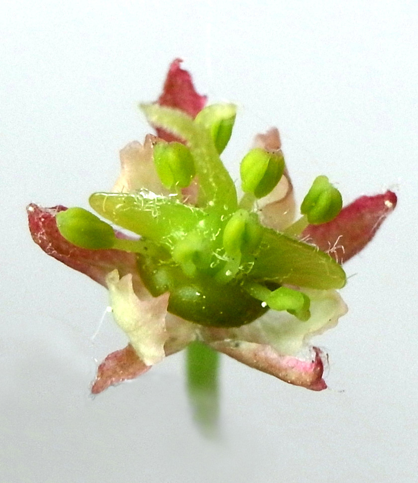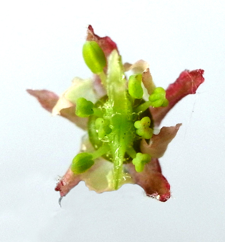 雌花 : 短い花糸をもつ雄しべが8本と,雌しべがある