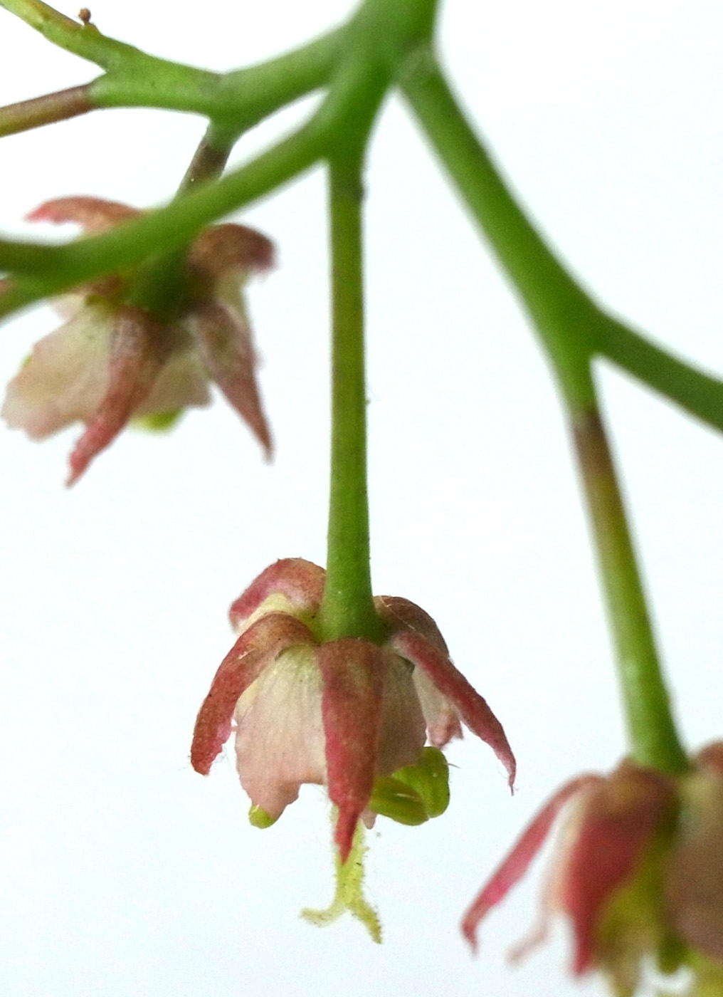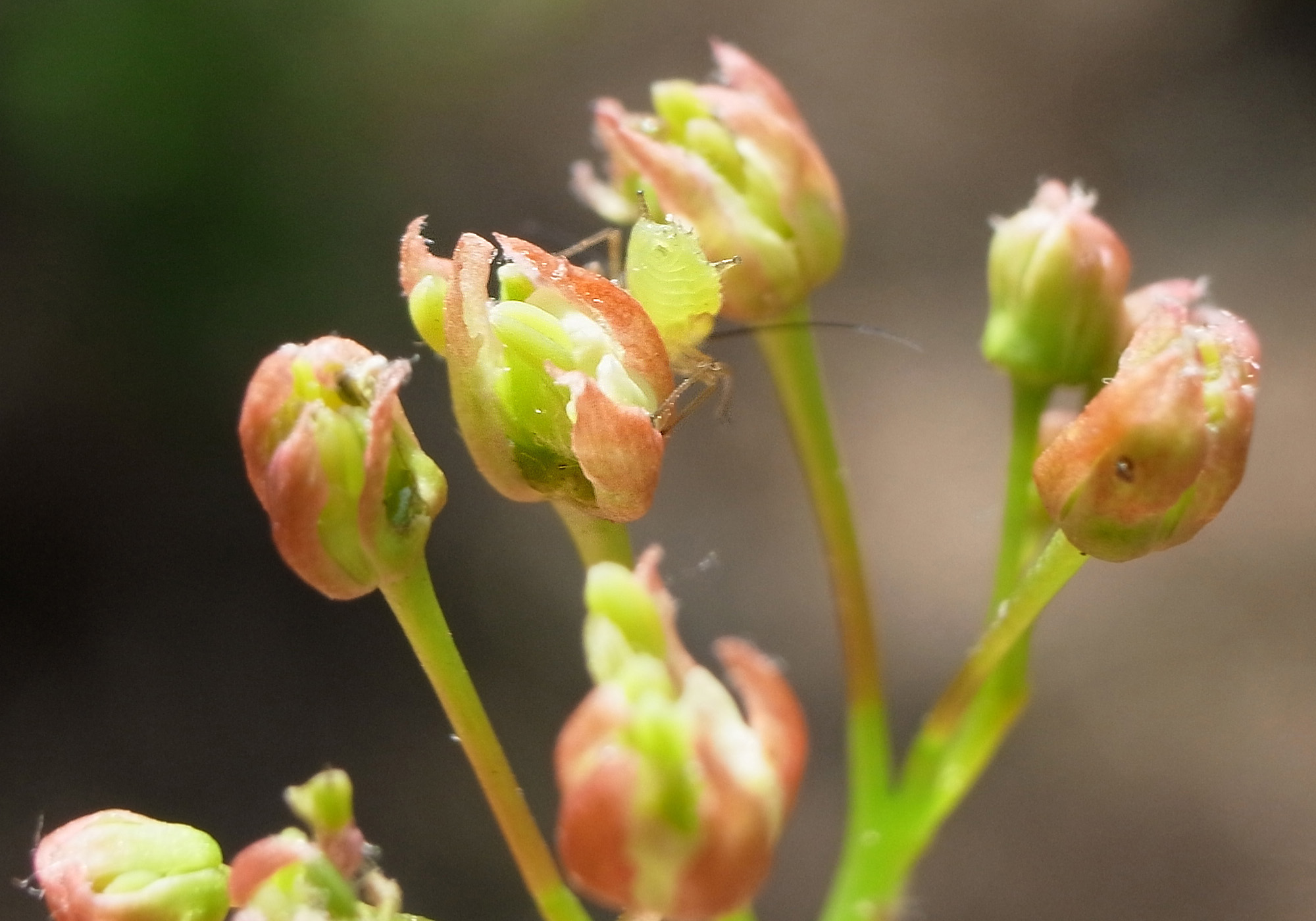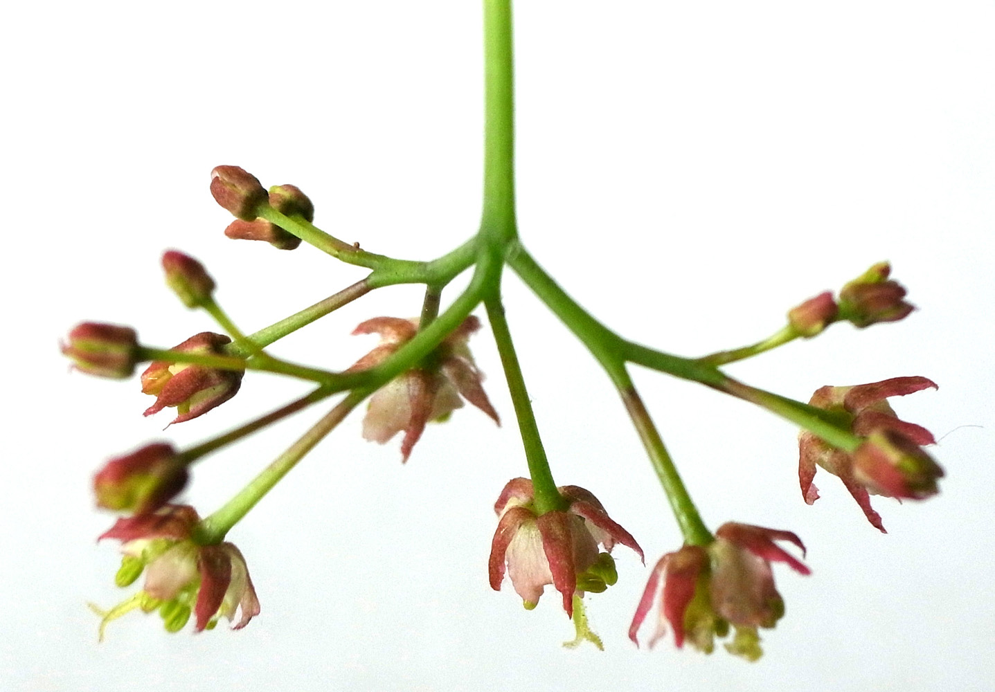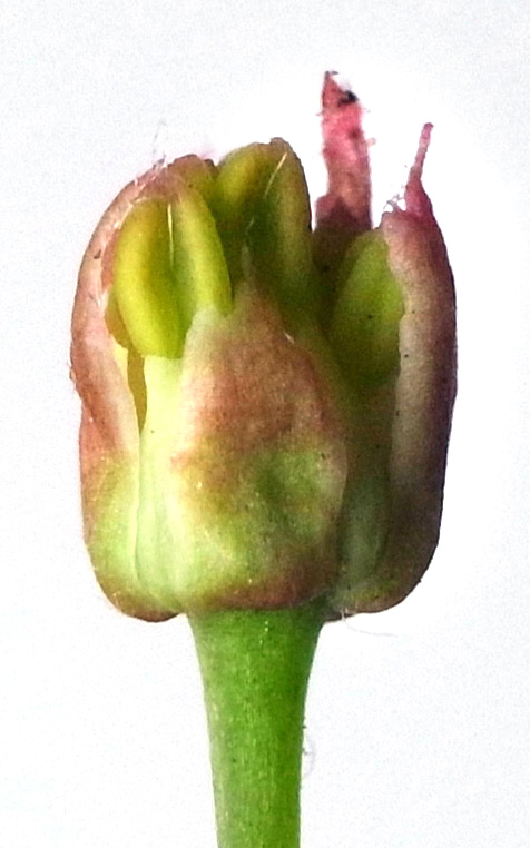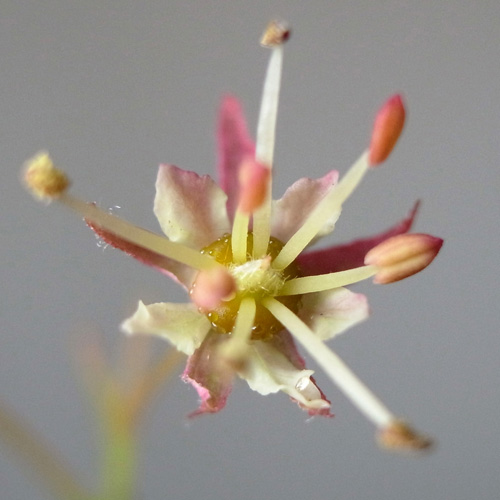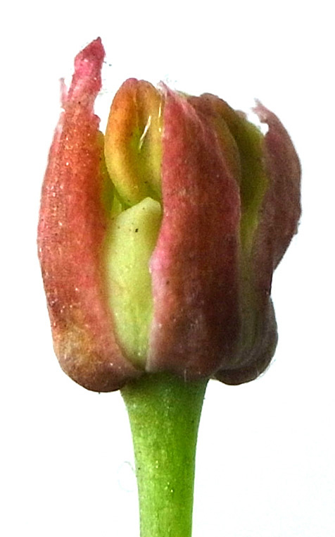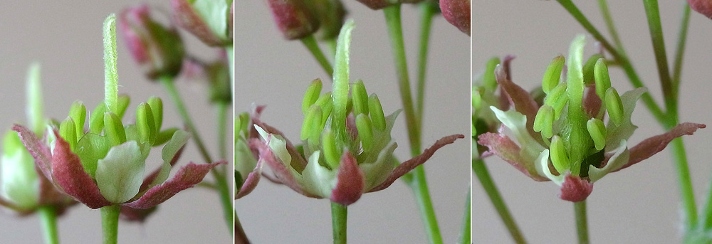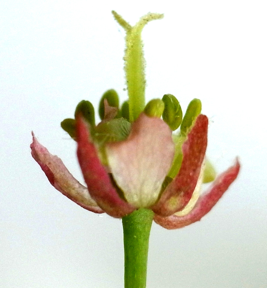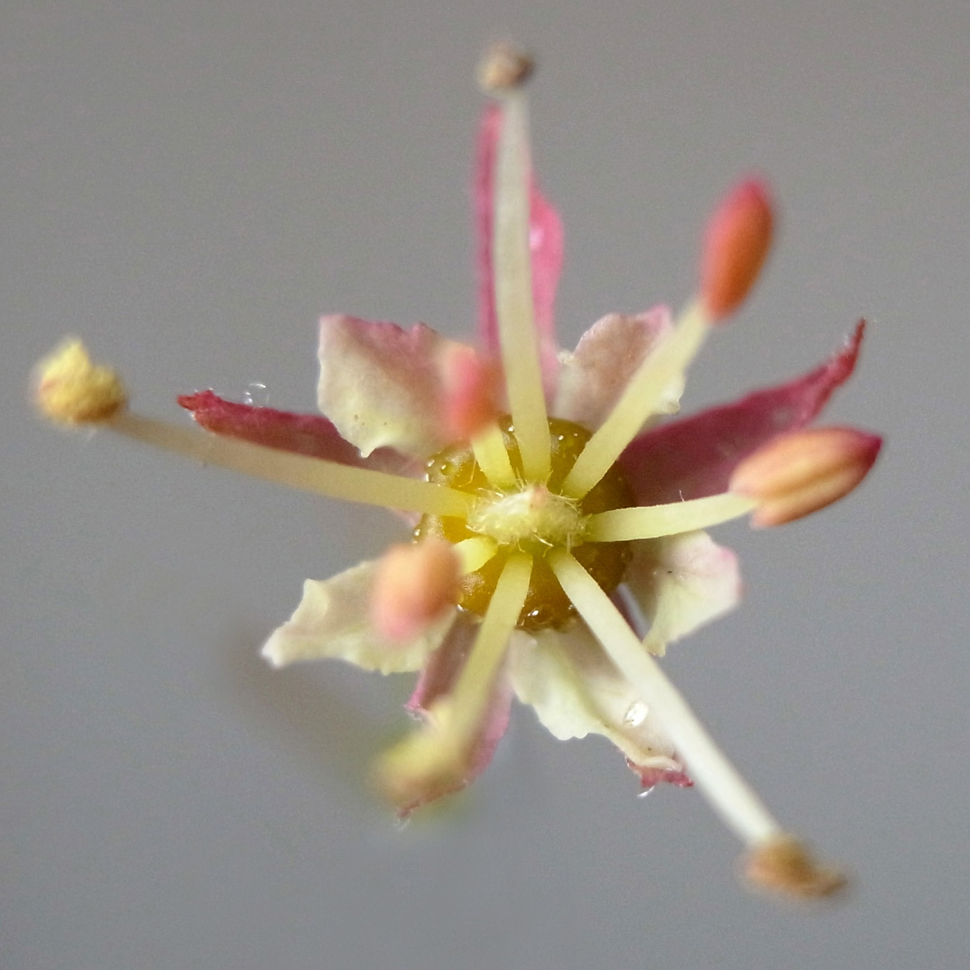 雌花 : 短い花糸をもつ雄しべが8本と,雌しべがある