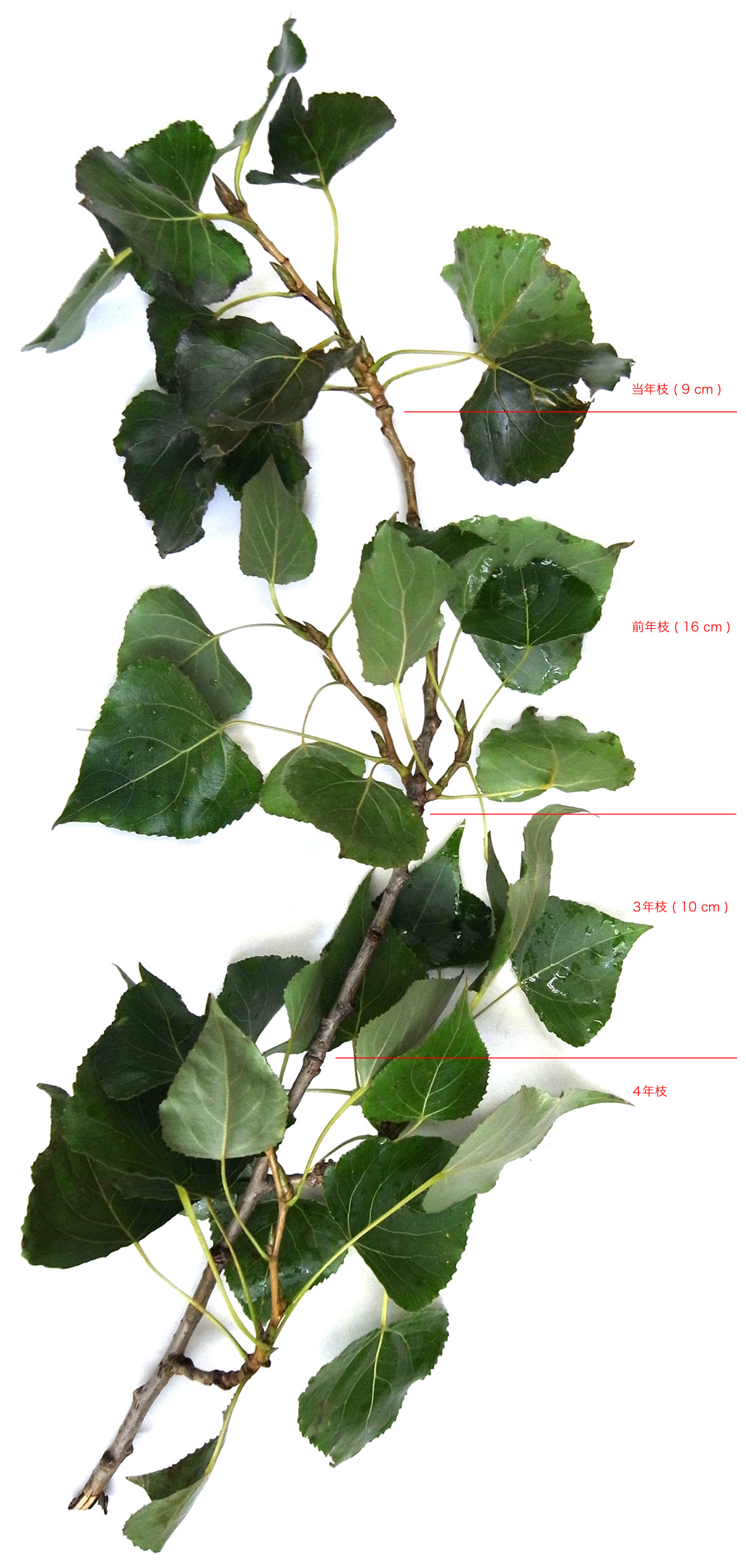 短枝 (当年枝(4cm)─前年枝(1.8cm)─3年枝(2.5cm)) ─4年枝