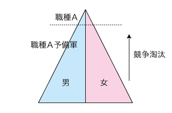 「男女共同参画社会」の立場は,「各職種において男女比率が半々」を「男女共同参画社会」実現の指標/規準 (criteria) にするものになる。 そこでいま,「各職種において男女比率が半々」の論理的含意を展開してみる。 「各職種において男女比率が半々」は,「各職種において,それの予備軍・すそ野のところで男女比率が半々」を含意する: