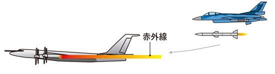 ミサイルを目標に誘導する方法はいくつかあり、その1つが赤外線誘導だ。高熱のエンジンなどから発生する赤外線を目掛けてミサイルが飛んでいくもので、空対空ミサイルなどに多い。フレア(発光弾)など、高温を発する『おとり』に弱いというデメリットがある。レーダー誘導も主流の1つ。