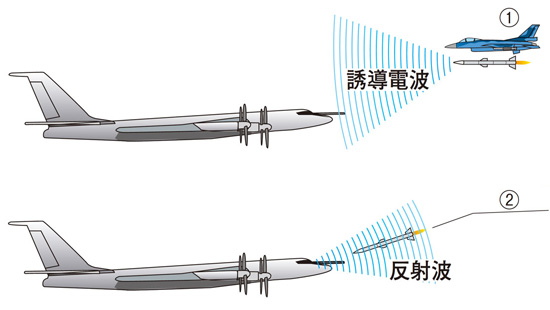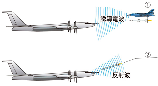 1: ミサイルの発射元となる航空機が誘導電波を発して目標物を捜索
