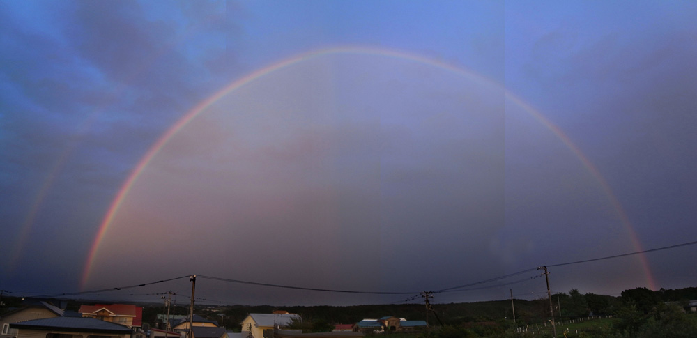 そうすると,まだ雨が降っている東方向に虹がかかる。