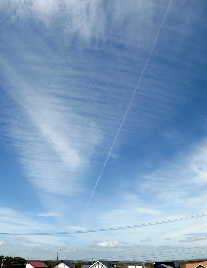 飛行機雲の上に筋状になった巻積雲: