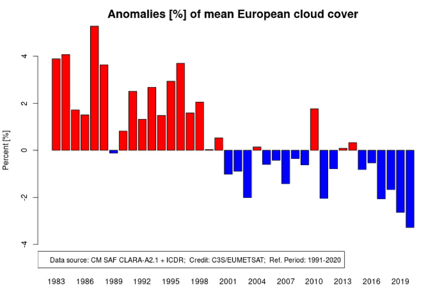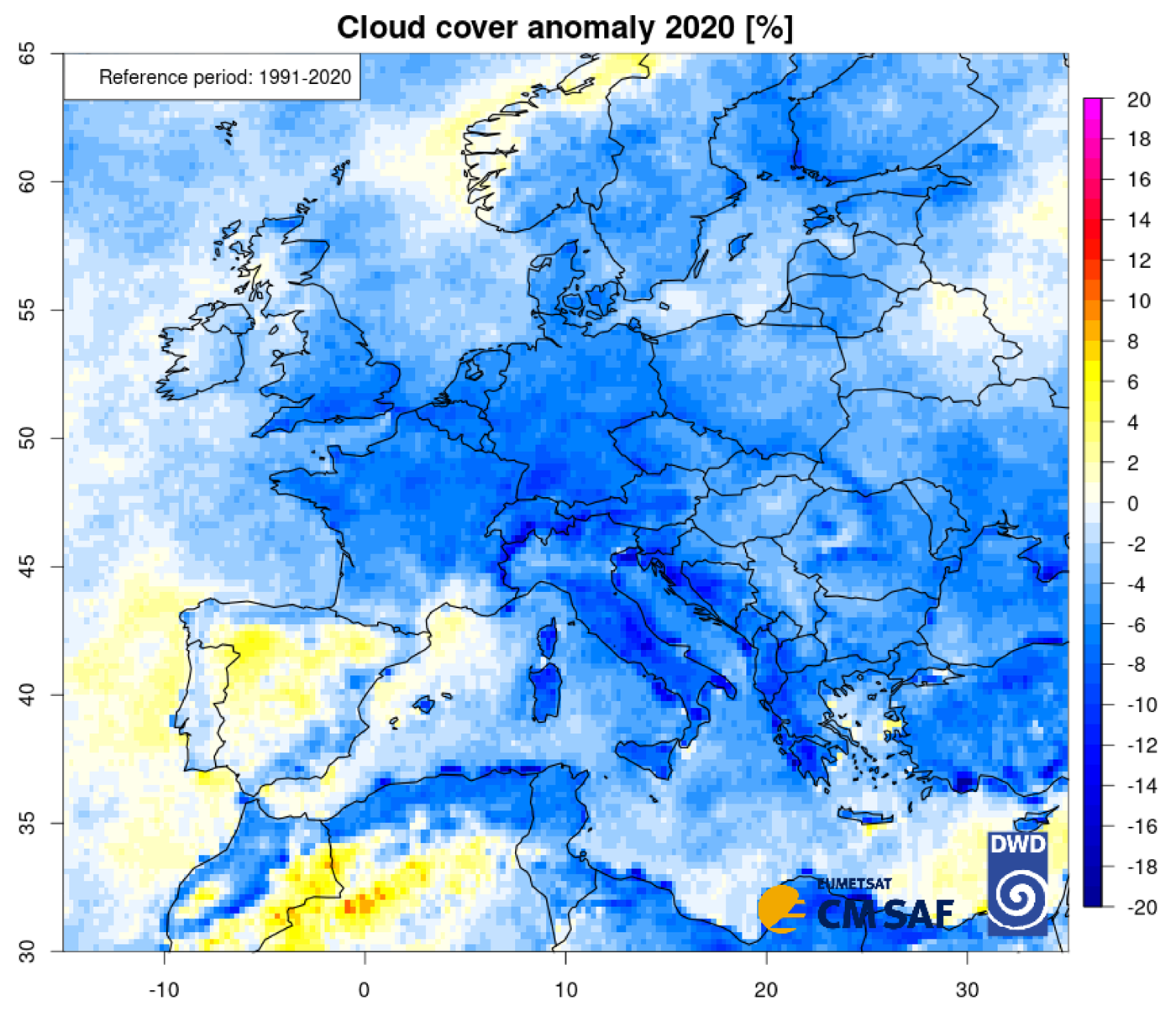 (表示内容は,雲量の 1991-2020 の平均に対する 2020年の偏差(%))