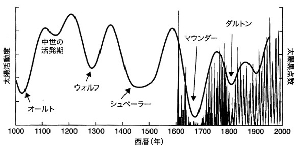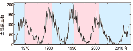このグラフに,太陽黒点数の変動のグラフを並べてみる: