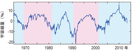 この比は,年ごとに変化することが認められる。 この変化は,炭素14の生成される量が年によって違うことを示している。 炭素14 を生成しているものは,地球の大気圏に進入した宇宙線である。 そこで,<炭素12に対する炭素14 の量比>の変動を,地球の大気圏に進入してくる宇宙線量の変動と読む。 これにより,宇宙線量の変動が定量的なものになる。 これをグラフにすると,つぎのようになる: