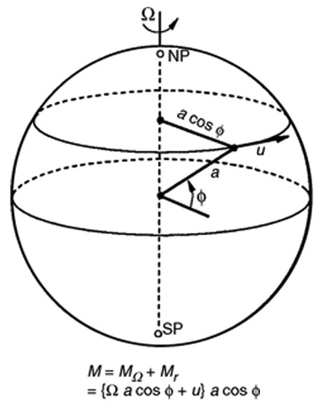 \[ M = Ω\ a^2 = ( Ω\ a\ cos\phi + u_\phi)\ a\ cos\phi \quad \quad (6.17) \]