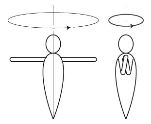 実際,フィギュアスケートのスピンを「角運動量保存」の話にするときは,つぎの絵を描くことになる:
