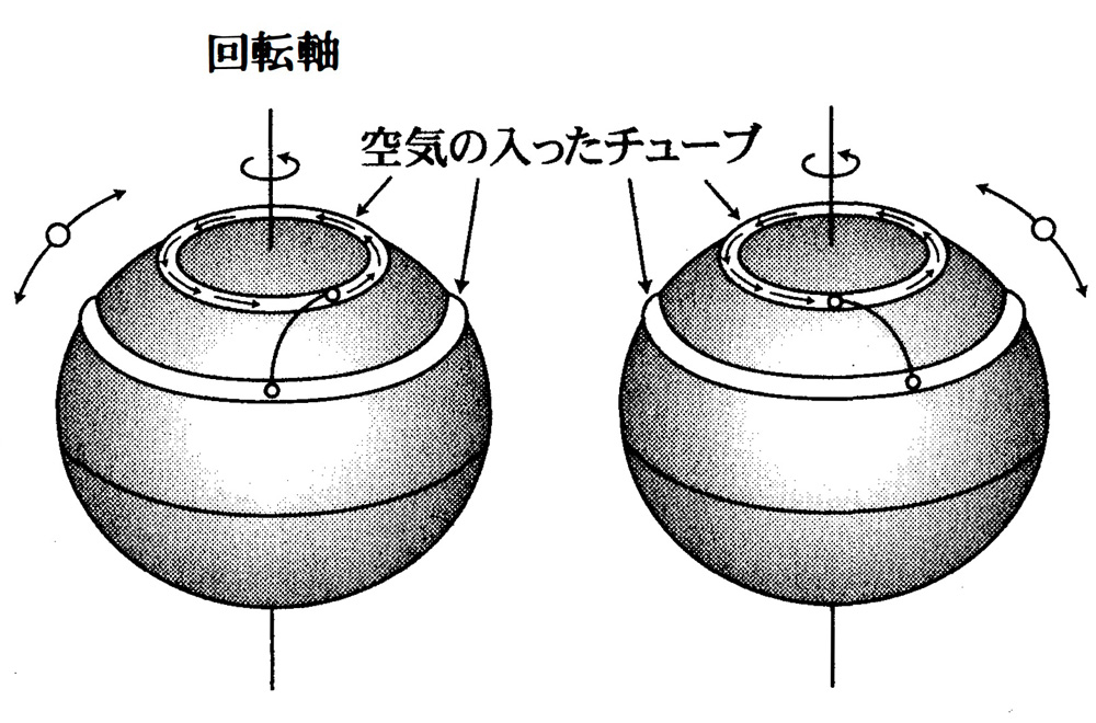 チューブの中の空気塊は、北に移動することで東向きの加速度を受けるが、これがコリオリ力である。