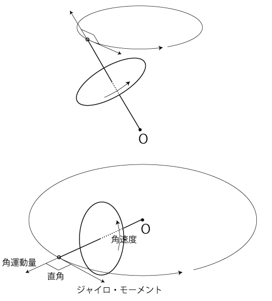 注意: ジャイロ・モーメントは,「角運動量ベクトルと直角」であって,「自転の回転方向と直角」ではない。 ──「自転の回転方向と直角」なのは,角運動量ベクトルである。