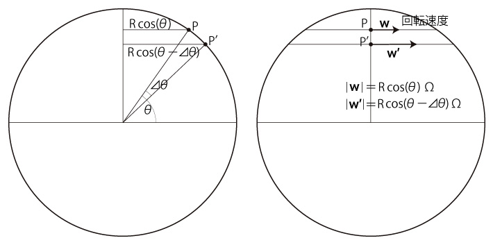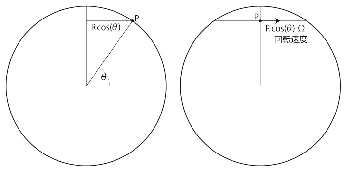 緯度 \( \theta \) の地点の回転速度は,つぎのようになる: