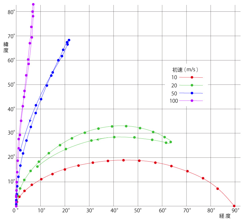 赤道で北へ発したときの,その後の移動軌跡