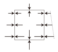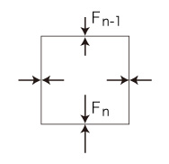横方向の力の大きさは? これは縦方向の力の大きさと等しい (圧力の等方性)。 実際,等しくなければ,An の中で水の流れが生じることになる──圧力の高いところから低いところへ。 ただし横方向の力の大きさは,An の上面から下面へ Fn−1 から Fn に推移する。