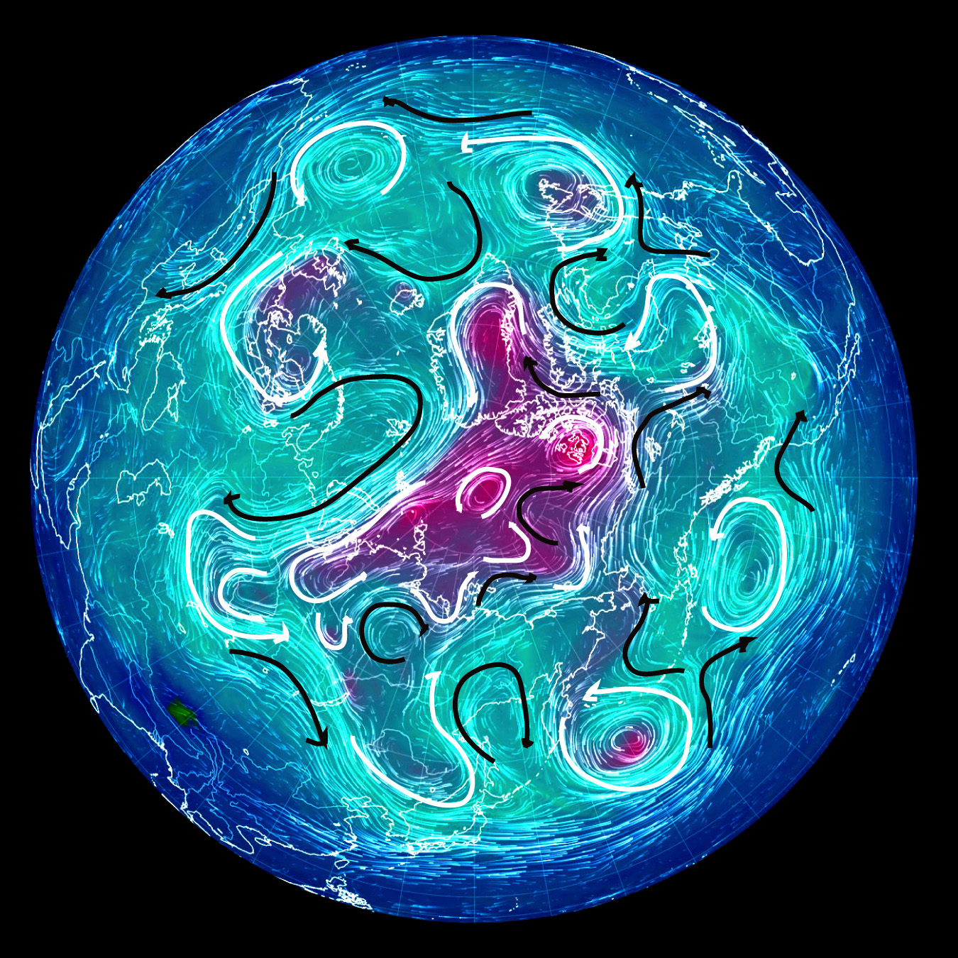50, 500 hPa 面天気図では,白が左回転の流れ,黒が右回転の流れ