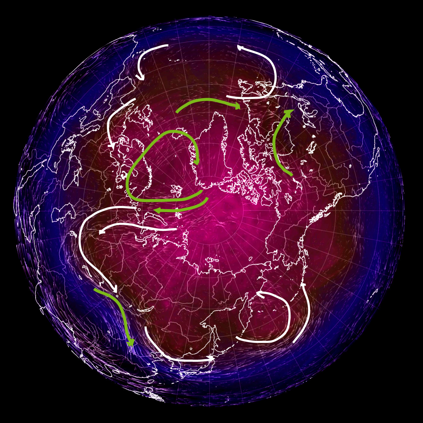 70 hPa 面天気図では,白が左回転の流れ,緑が右回転の流れ