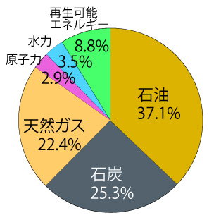 日本の化石燃料エネルギーの消費は,エネルギー消費の 85% を占める (2019年):