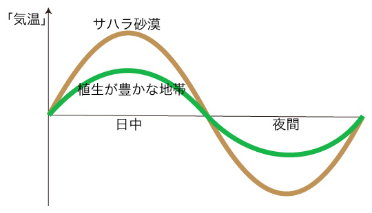 即ち,熱せられた空気の中にいることが,暑いことだと思っている。 そこで,暑さの程度を知るのに,「気温計」を使う。 月には空気は無いが,温度計を設置すれば,「赤道は,昼が110℃,夜は −170℃」となる。 「暑さ」は空気の温度が高いことではない,というわけである。 そこで,「温度」とは何かという話になる。 ひとは「温度」とは何かを考えることをしないので,「暑さは,熱せられた空気のせい」と短絡してしまうのである。 温度のもとは,電磁波である。 温度は,「電磁波の分布」の現象である。 分布の違いが,温度の違いになる。 人の寒暑の感覚は,体組織が電磁波に感応し,感応の位相を脳が意識に表現しているわけである。 人間の体もまた,温度計である。 ひとはこの温度計を,「気温計」と対応づける。 これが,「寒暑を知る道具として気温計を使う」の構造である。 さて,近年は,夏になると「猛暑」「熱中症に注意」が連日ニュースになる。 そして,これの理由として「地球温暖化」が唱えられる。 「暑さ」とは何かを考えることのない者は,「暑さ」を「地球温暖化」で片付けようとする。 先に,月の昼夜の極端な温度差について触れた。 この温度差を考えるヒントになるものが,地球にもある。 サハラ砂漠 (サハラの砂サバク) である。 そこは,昼夜の温度差が大きい。 その温度は,空気の温度ではない。 実際,「気温計」は,太陽光由来の電磁波を測っている。 ひとは「気温計」が空気の温度を測っていると思っているが,「気温計」はただ温度を測っているのである。 サハラ砂漠の昼夜の温度差が大きいとは,太陽光由来の電磁波の量が昼夜で大きく違うということである。 即ち,昼は空気中の水粒子量が少ないため,日射が散乱されず強い。 そして砂が,その強い日射を反射する。 気温計は,この両方の電磁波に感応して,高温を示す。 夜の太陽光由来の電磁波は,地中から発せられるものがすべてになるが,これは少ない。 植生の豊かな大地だと,日射の電磁波は土壌を温めるという形で,吸収される。そして温まった土壌が放射する電磁波に,夜の「気温計」は感応する。 しかしサハラ砂漠では,日射は反射され,地中は暖まらない。 灼熱の太陽の下の砂漠の表面は焼けつくように熱いが,それは表面だけのことである。 こうして,夏の晴れた1日の「気温」(「気温計」が示す値) の変化は,サハラ砂漠と植生の豊かなところではつぎのように違う: ![]() ひとが「地球温暖化」だと思っている/思わされている「猛暑」「熱中症に注意」は,生活空間の「砂漠化」によるものである。 植生を貧困にし,そしてコンクリートとアスファルトで生活空間を固めてしまったために,夏の晴れた日中は,日射とその照り返しの強力な電磁波の中に棲むことになった。 その生活空間の夜間が砂漠ほど温度が大きく下がらないのは,砂漠と比べると日中に電磁波を吸収して温まっているところが多いからである。 また,生活空間を火力・電力で人工的に温めているからである。 ひとは「気温」のことばから,空気の風呂に浸かっているイメージをもつ。 しかし生活空間は,空気の風呂ではなく,電子レンジに喩えられるものである。 ひとは,<生活空間=電子レンジ>のワット数を上げることに,これまでせっせと努めてきた。 その報いが,夏の晴れた日の猛暑というわけである。 「気温」は空気の温度ではない
