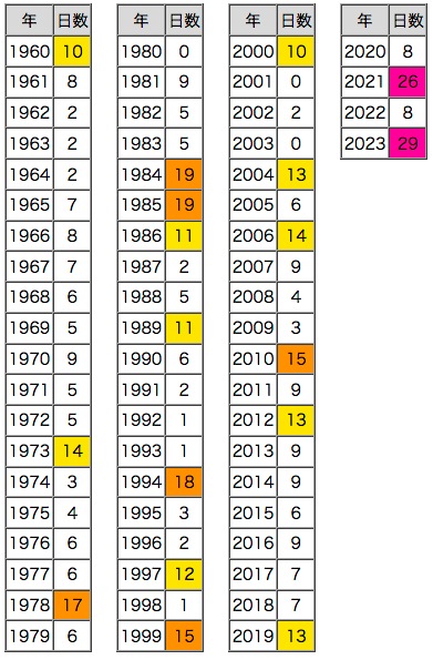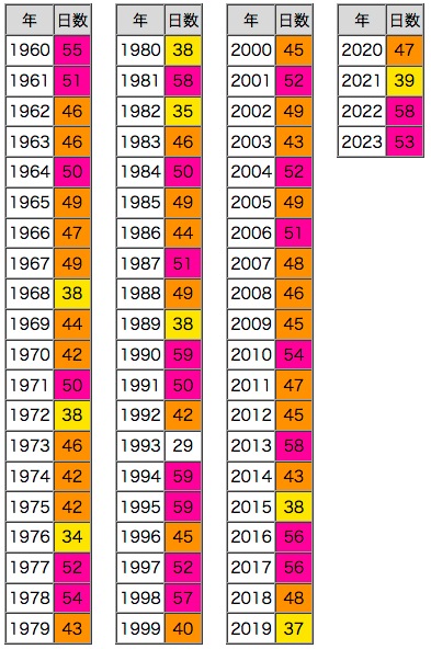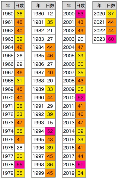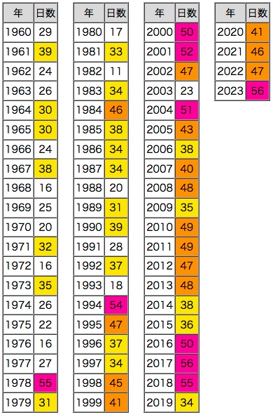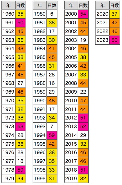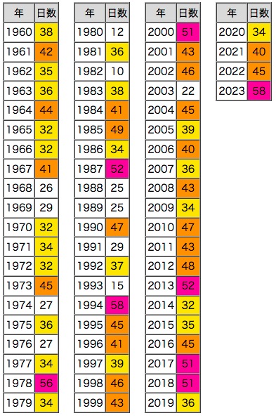 紫 : 50日以上,橙 : 40日以上,黄 : 30日以上 |