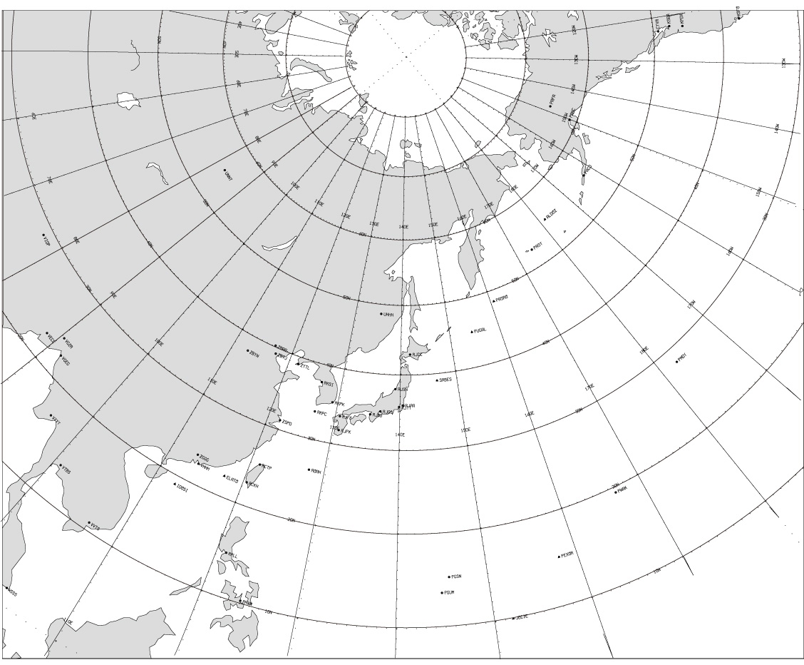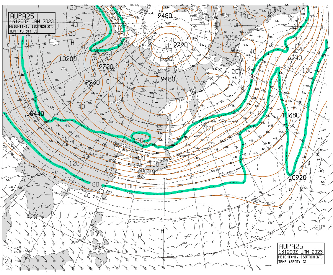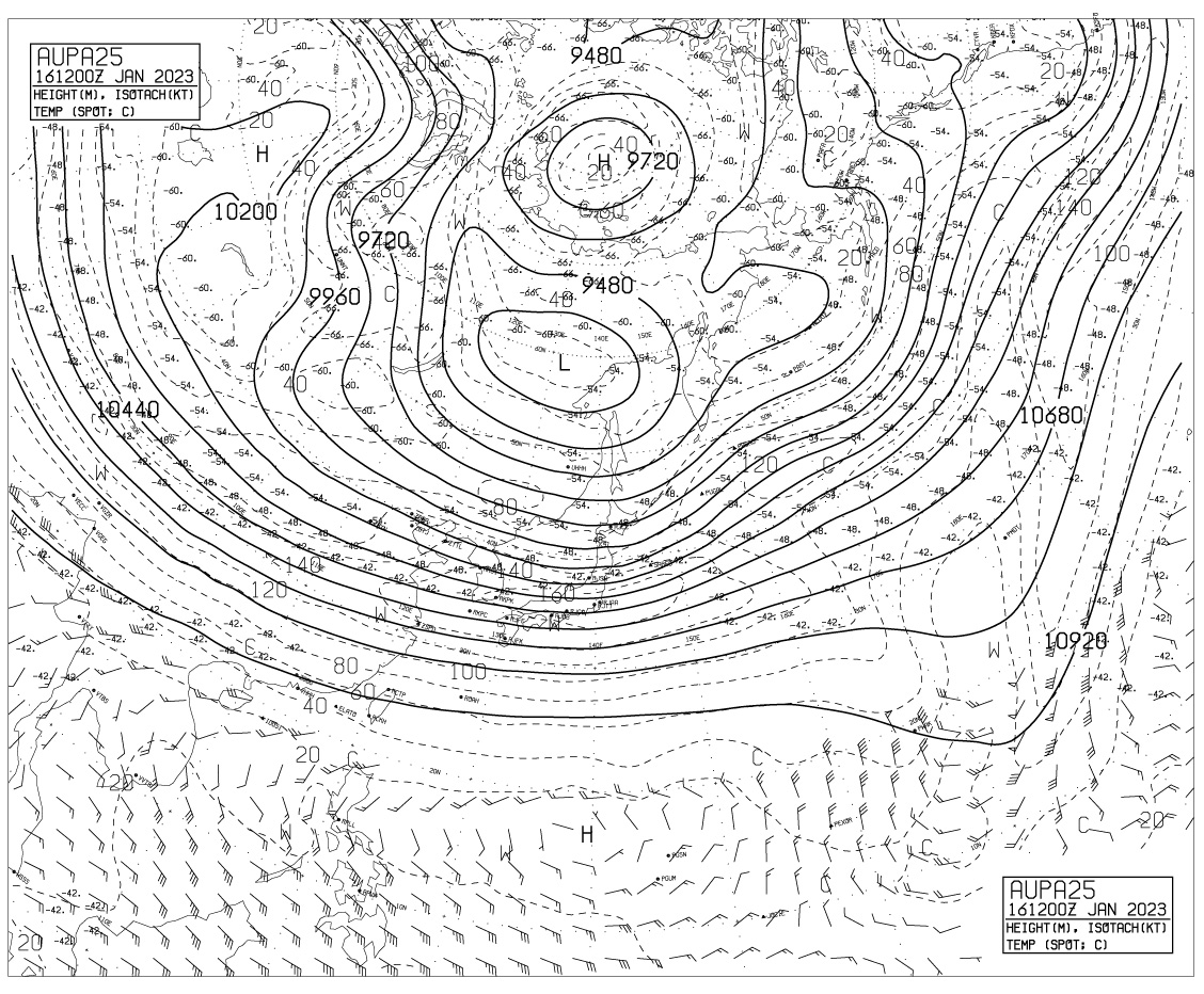 - 60kt以上の風向・風速を,矢羽根, ペナント記号で表示。