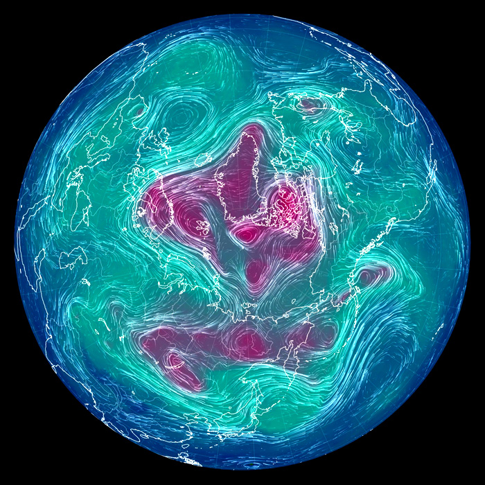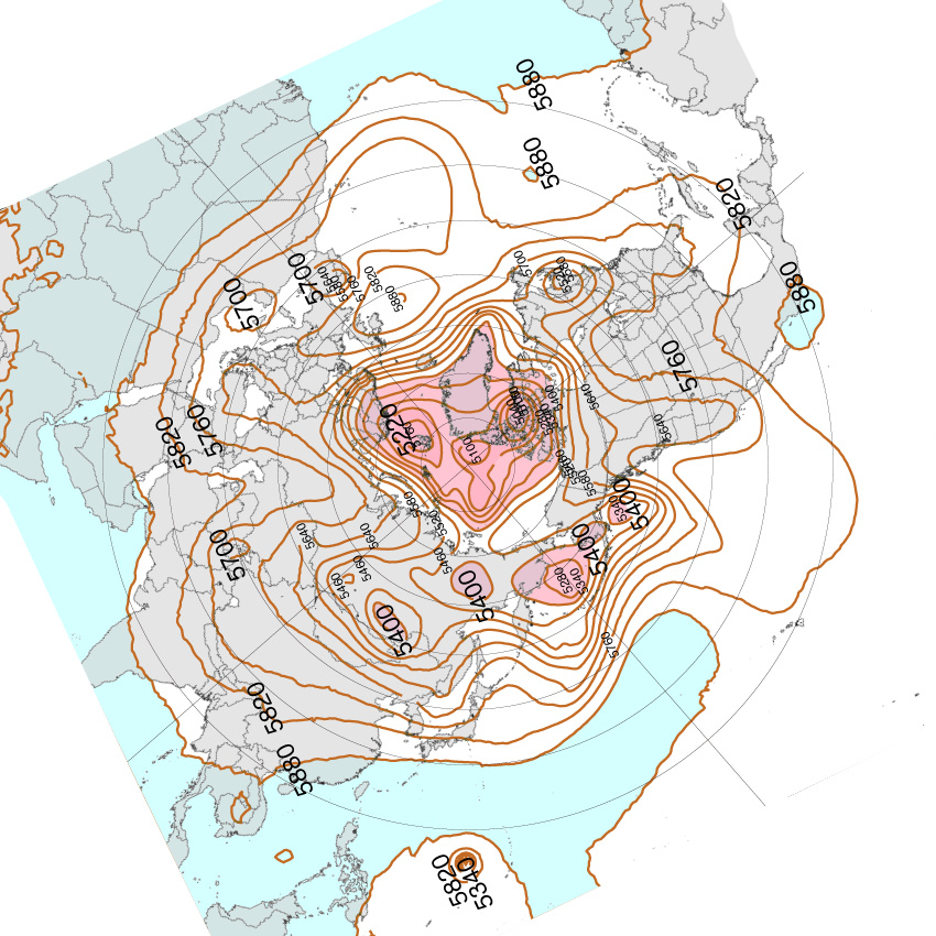 天気の状況は大気の状況であり,そして大気の大局的状況は 500 hPa 面天気図においてよく示されるからである。 そしてその天気図は,earth.nullschool.net の風・気温天気図がよい。 気圧天気図 (等高度線で気圧を表現) は,特に必要としない。 気圧の布置は,風・気温天気図から分かるからである。 即ち,つぎが成り立つ ( 日々の天気を大局的に理解する法):