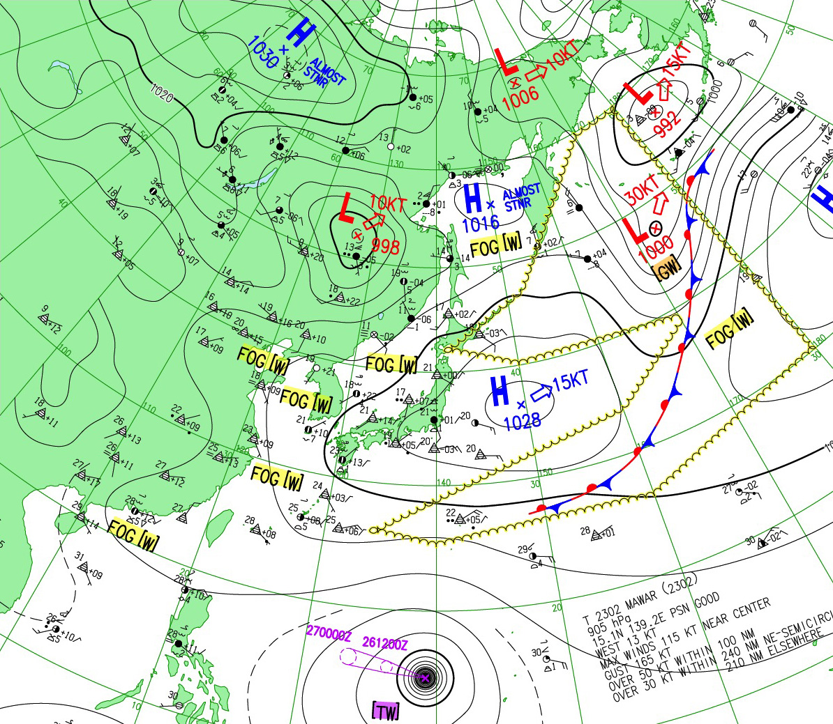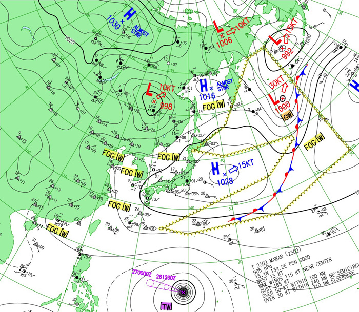 つぎの同時刻 (2023-05-26 09:00) の天気図で,このことを確かめよ: |