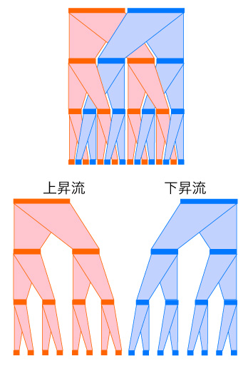 そして上昇流・下降流は下から上まで一本なのではなく,支流に分岐し,そして各レベルにおいて絡み合う: