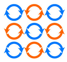 上昇流は,周りの流体粒子を吸い込む渦柱になる。 下降流は,周りに流体粒子を押し出す渦柱になる。 2種類の渦柱の束は,2種類の渦の回転方向が逆であれば安定する (「ベナール渦」):