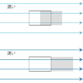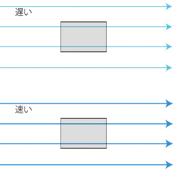 速さの違いが2倍であるとき,遅い流れの筒に入っている空気粒子数は,速い流れの筒に入っている空気粒子数の2倍になる: