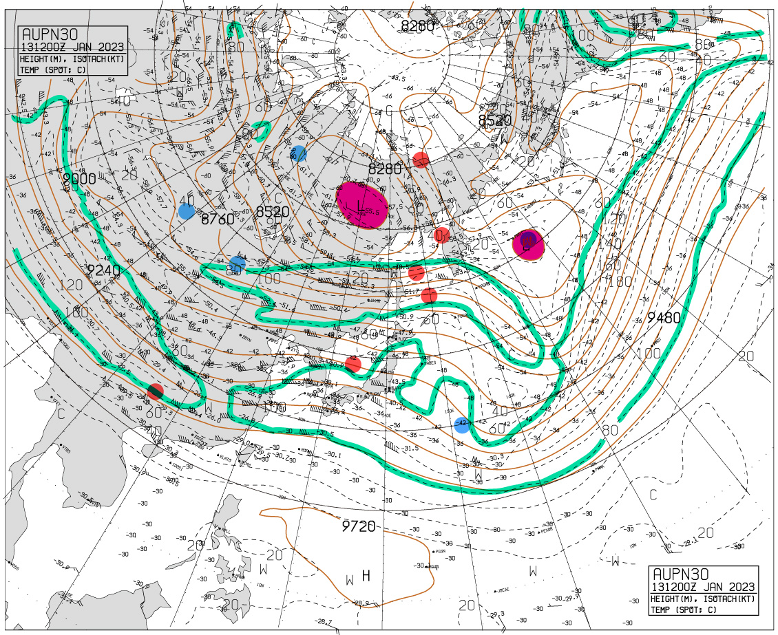 緑線:80kt 等速線 赤丸・青丸:それぞれ地上の低気圧と高気圧の位置 |