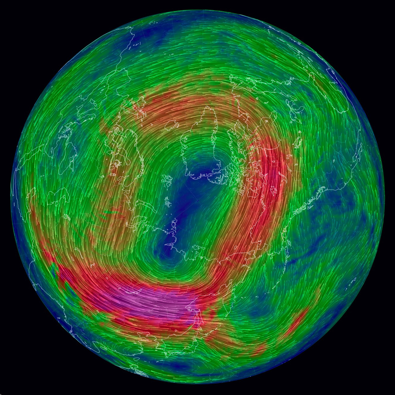 このとき天気図は,つぎのようになる: ○ earth.nullschool.net 70hPa |