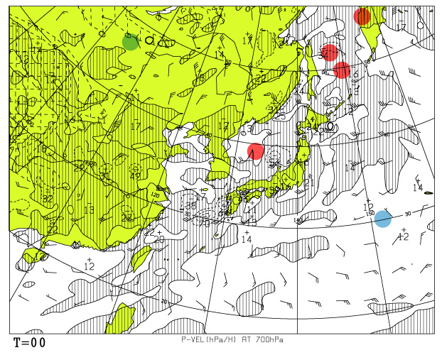 下降流か上昇流かを見る高層天気図として AXFE 700hPa があるが,「左のL」「右のL」のどちらとも AXFE 700hPa の表示領域から外れてしまう。 ○ AXFE 700hPa |