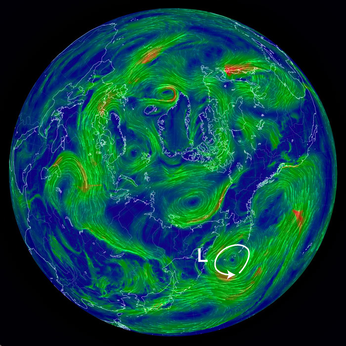 「低気圧」は上昇流に対応している。 即ち,上昇流は地上から空気を吸い上げ,地上に低気圧をつくる。 所謂「温帯低気圧」は,これである。 北方の赤丸低気圧は,これに該当する。 ○ earth.nullschool.net 500hPa |