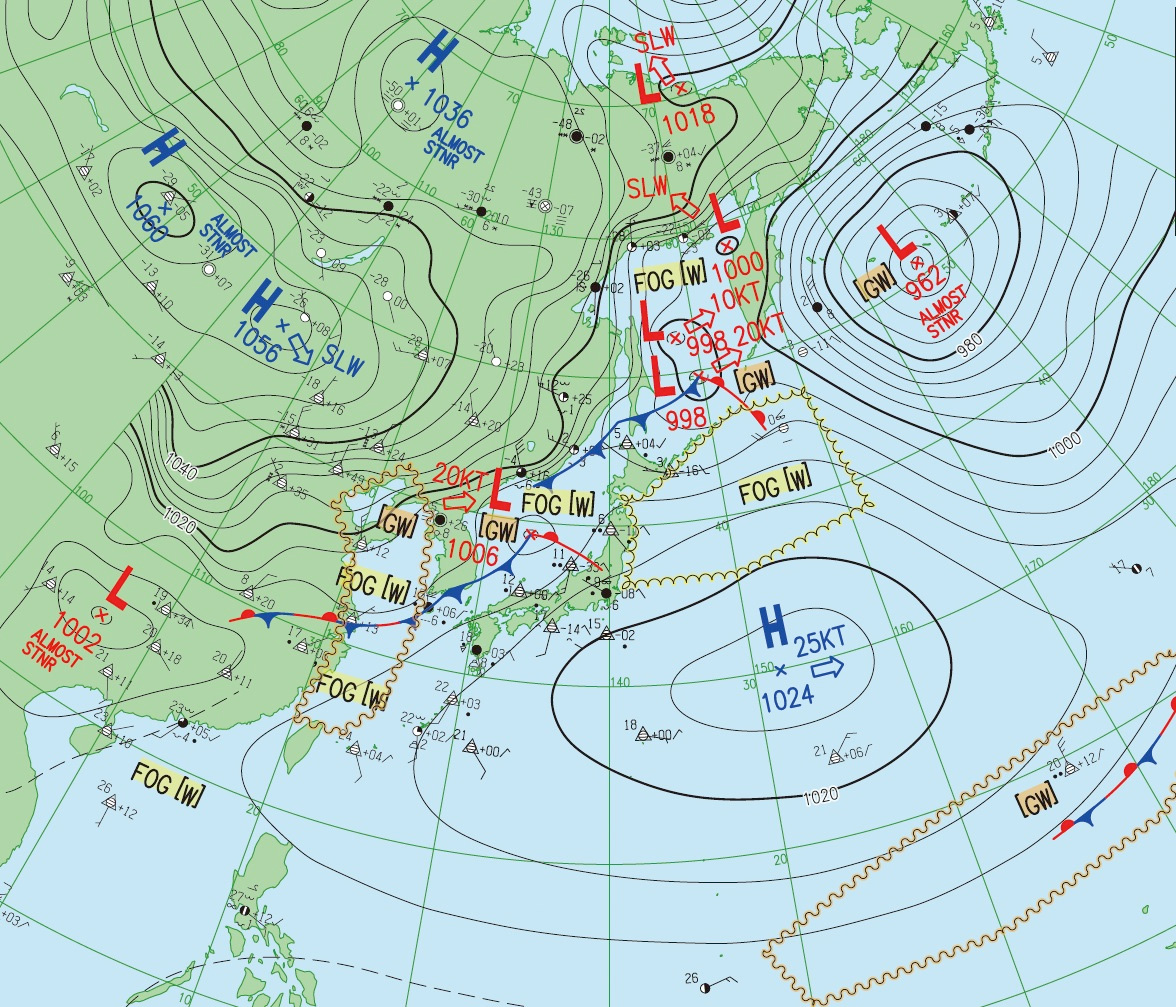 冬の暖気・雨は,つぎの二つが合わさったときの現象である: ○ 気象庁 地上天気図 |
