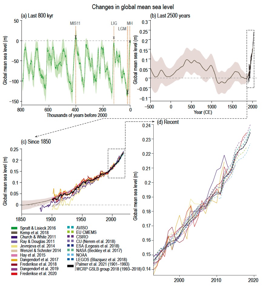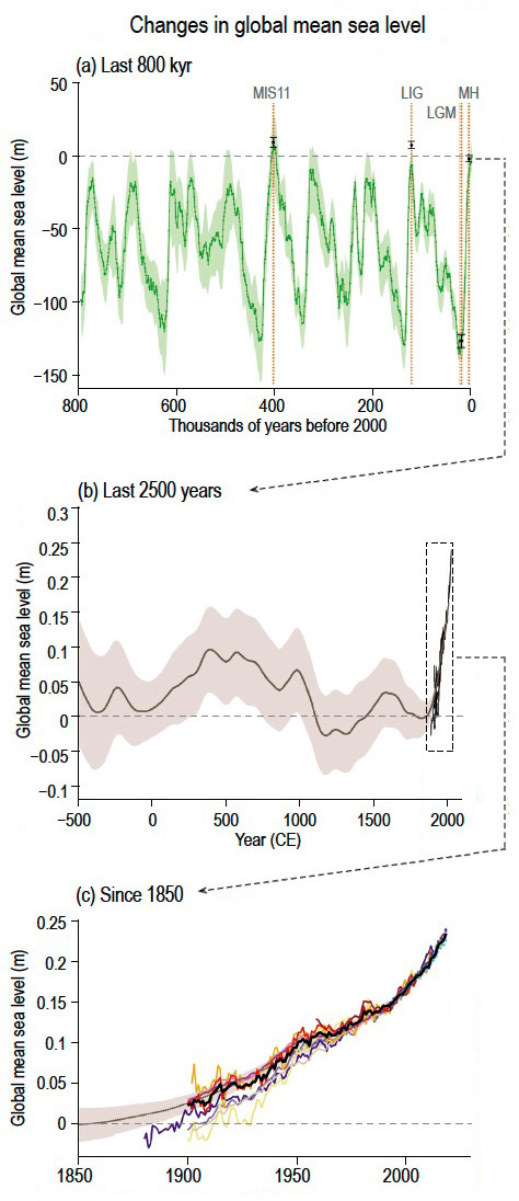 「人為的地球温暖化」キャンペーンの総本山である IPCC でさえも,IPCC (2021) では「この120年間に 25cm 程度上昇」のグラフを示す(てい)である (p.354):