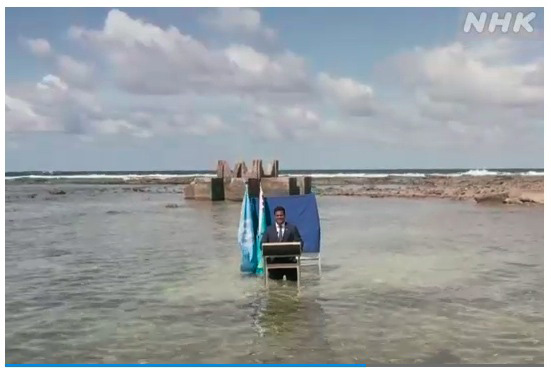 気候変動対策の国連の会議、「COP26」に合わせて南太平洋の島国、ツバルが動画を公開し、スーツ姿の外相がひざまで海水につかって海面上昇で水没が懸念される国の現状と気候変動への対策を訴えました。 ‥‥