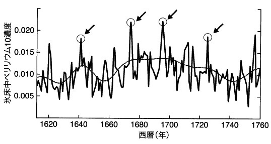 宇宙線の変動幅は現代においては最大でも20〜30%程度ですから、マウンダー極小期でその20〜30%に加えて28年に1度、一時的にさらに40%も宇宙線が増加していたというのは、宇宙線の気候変動への影響を検出する絶好の機会となります。