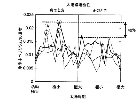 グリーンランドの氷床から得られたベリリウム10のデータを見てみると、そのとき、宇宙線が最大で40%も増加していたことが見て取れます。