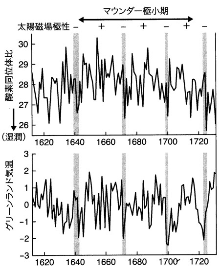 現代においては、太陽磁場の反転の影響は、宇宙線の変動パターンが11年ごとにわずかに異なるという程度にしか影響しませんが、マウンダー極小期では宇宙線の22年変動 (実際には太陽周期が伸びたために28年周期) の振幅が増幅していたことになります。