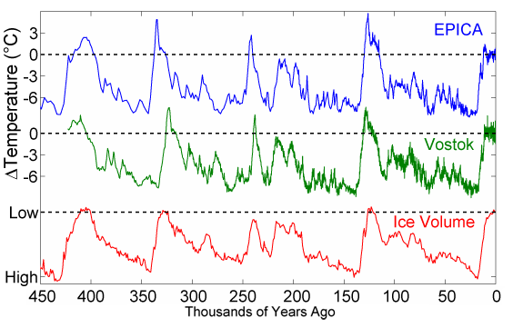 彼らは,前例の無い気温上昇がいま進行していると信じている。 彼らは,「地球温暖化」を「地球の気候変動の歴史」の文脈で考えるということを知らない。 そして彼らが思う「気温上昇」は,「猛暑に向かう」である。 彼らは,「気温変動」の中身を考えようとしない。 地球の気温変動は,百万年くらい前からは,氷期&間氷期の周期変動になっている: