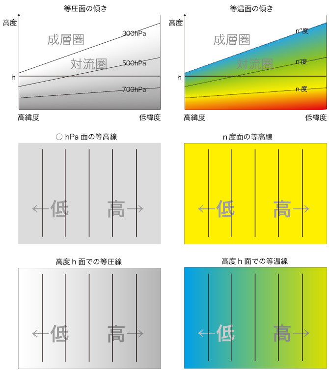 こうすると温度風は上空の地衡風と一致し、考えている高度までの鉛直平均温度の等値線と平行に北半球では低温部を左に見るように吹く。