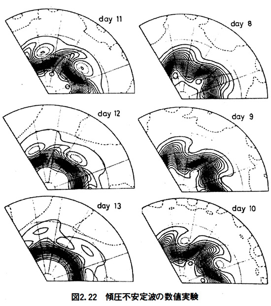 図2・22 は初期値から8日以降13日までの数値実験の結果で、紙面を節約するため上と同様に2波長分だけ描いている。