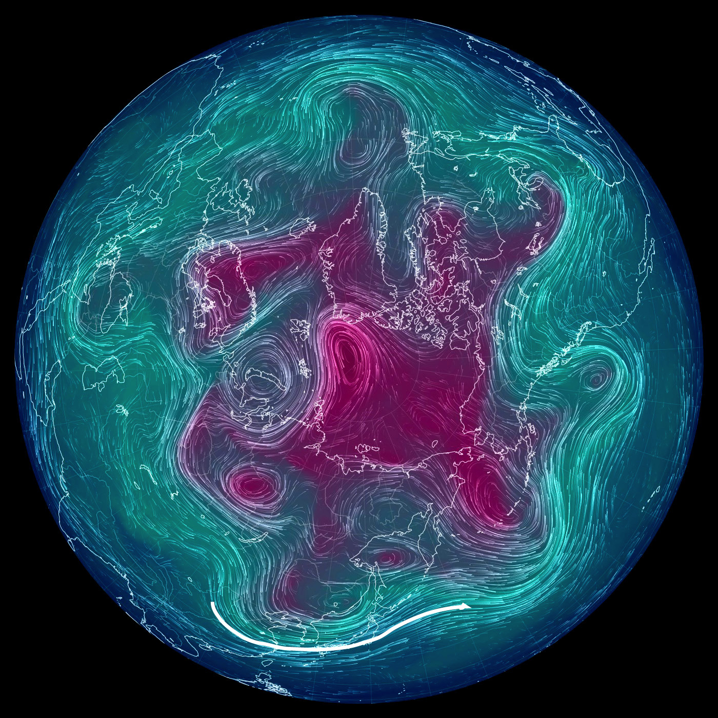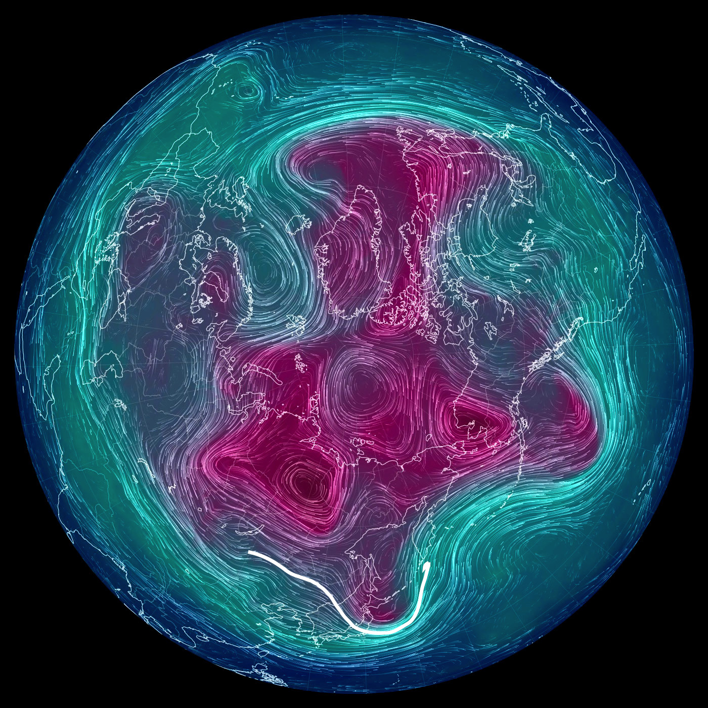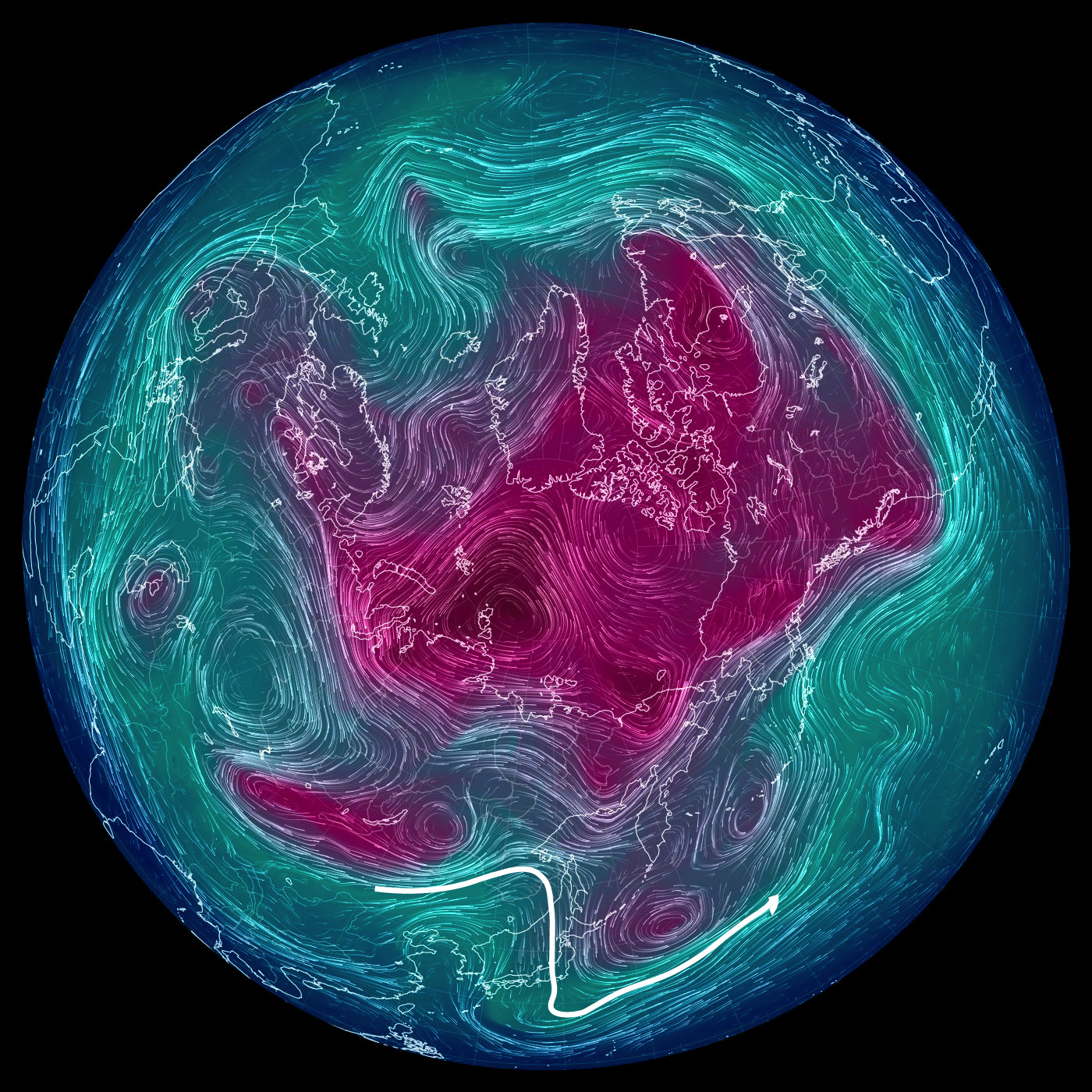 500 hPa 面天気図 (風の流れ・気温) では,東京を通過する風を白で表示。