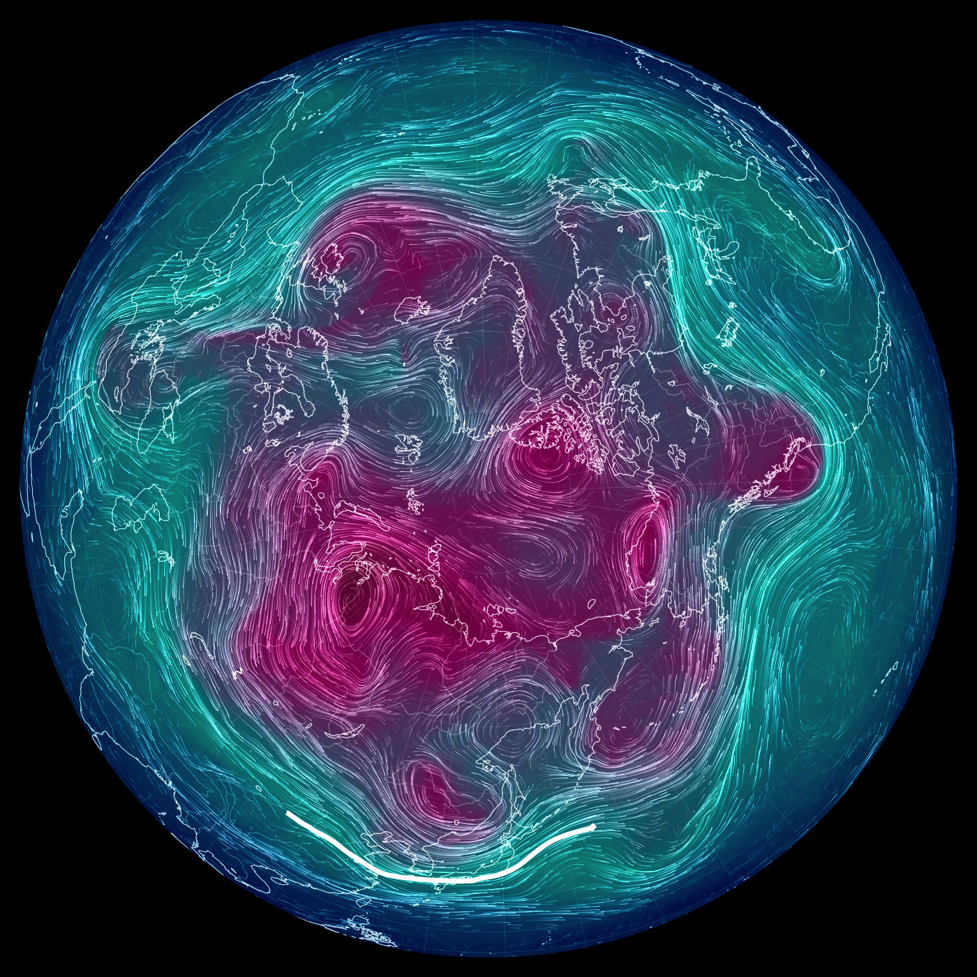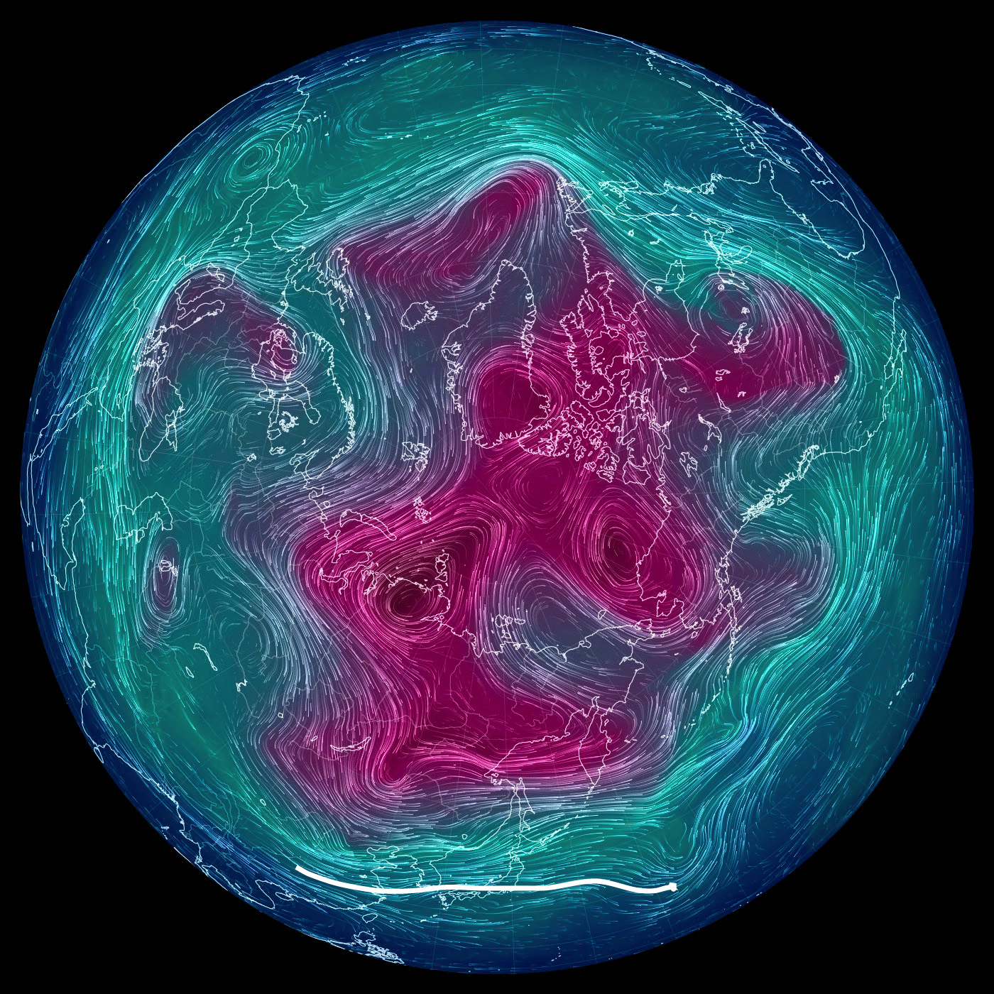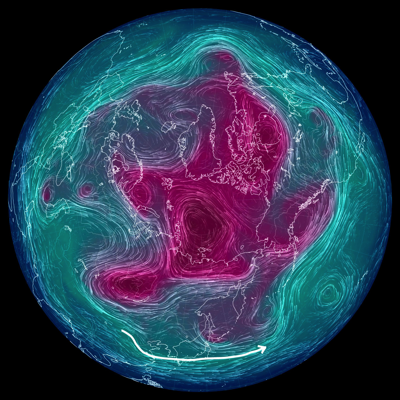 500 hPa 面天気図 (風の流れ・気温) では,東京を通過する風を白で表示。