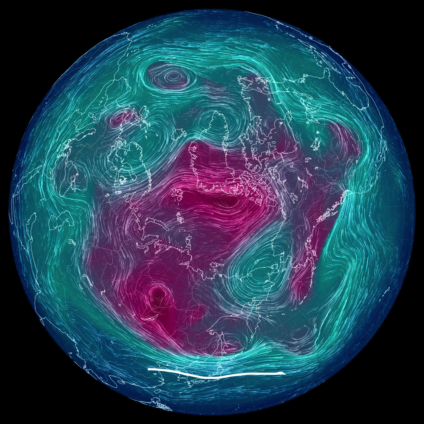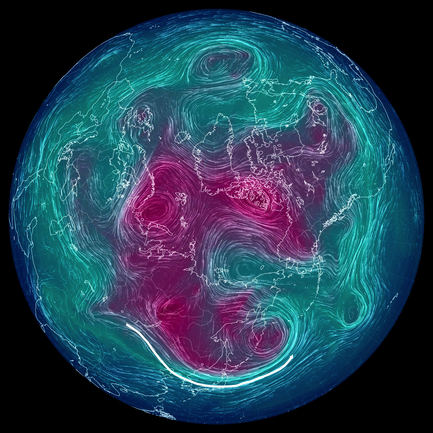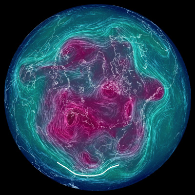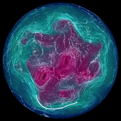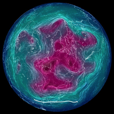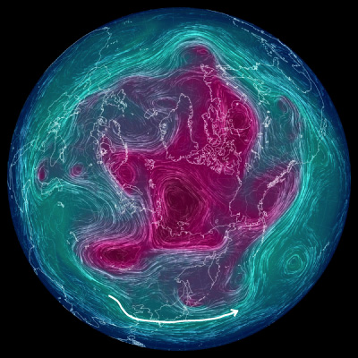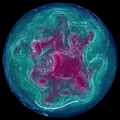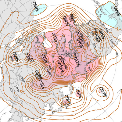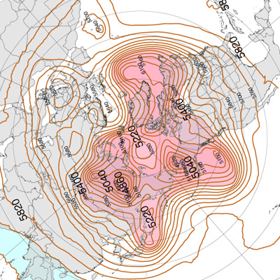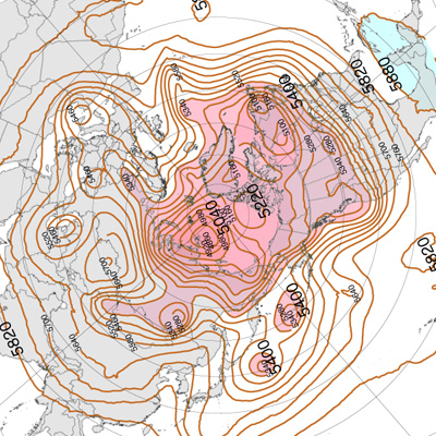 500 hPa 面天気図 (風の流れ・気温) は,赤紫色が寒気。